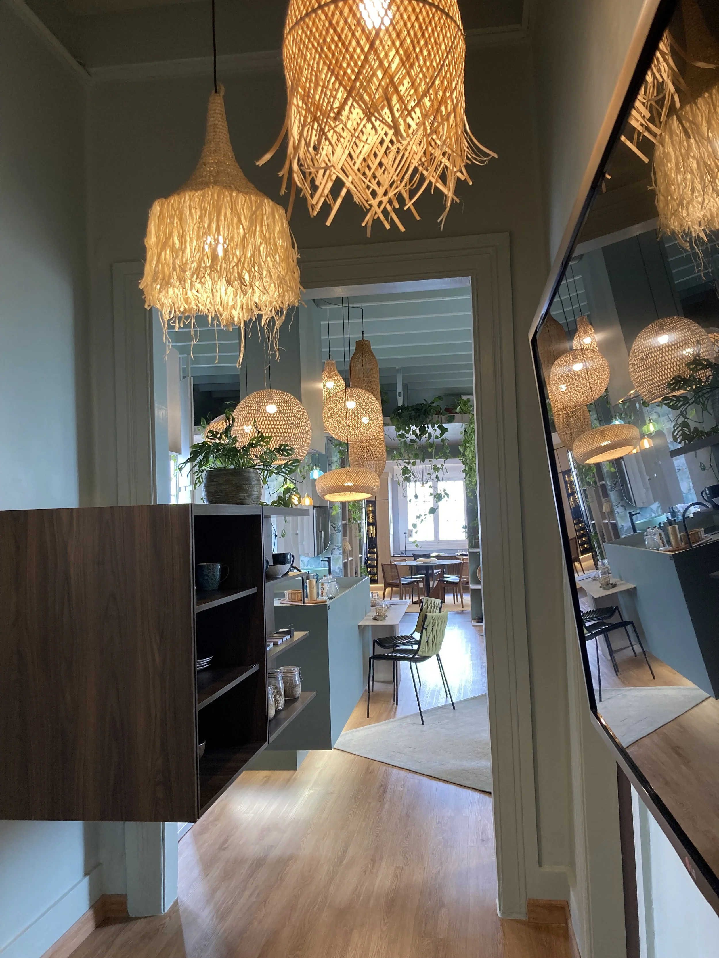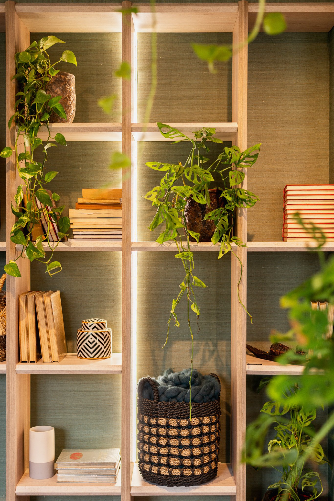 Para lograr una sensación acogedora que nos transporte a la selva, colocamos lámparas colgantes de fibras naturales que combinan con el piso de todo el loft en tono madera claro que contrasta con el mueble oscuro que se conecta al siguiente espacio y que representa el troco del Arbol de los sueños.