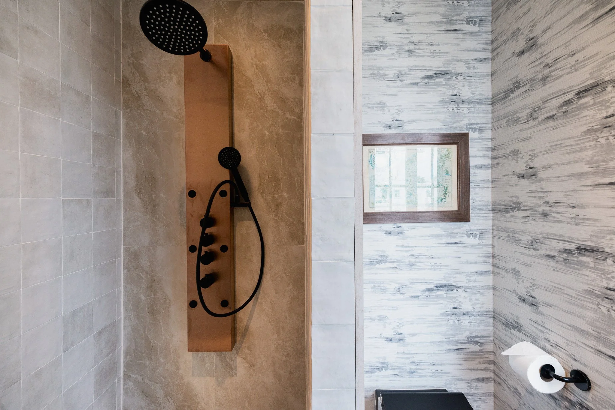 Hemos mantenido la esencia de lo que representa un Loft, donde no existen paredes que separen los ambientes pero aún así mantener la privacidad en este baño. Usamos el pequeño tocador como punto focal, con una cerámica artesanal que mantiene la conexión con la selva, así como un arreglo de luminarias coloridas que dan aún más vida al espacio.