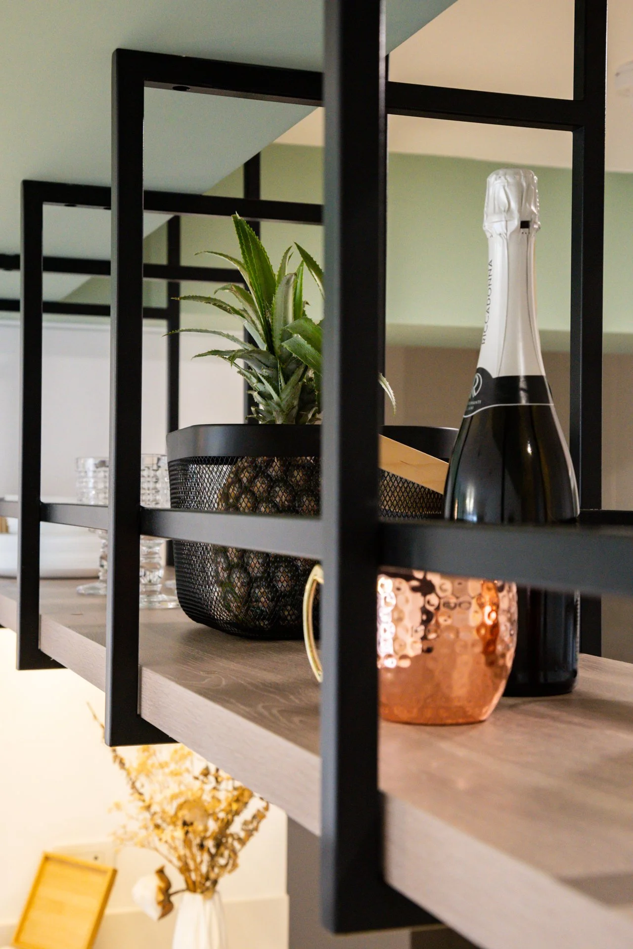 Sobre la barra de la cocina se diseñó un mueble auxiliar para almacenar el menaje diario y el menaje del bar. La iluminación inferior y los detalles en negro hacen de este mueble el punto focal del comedor.